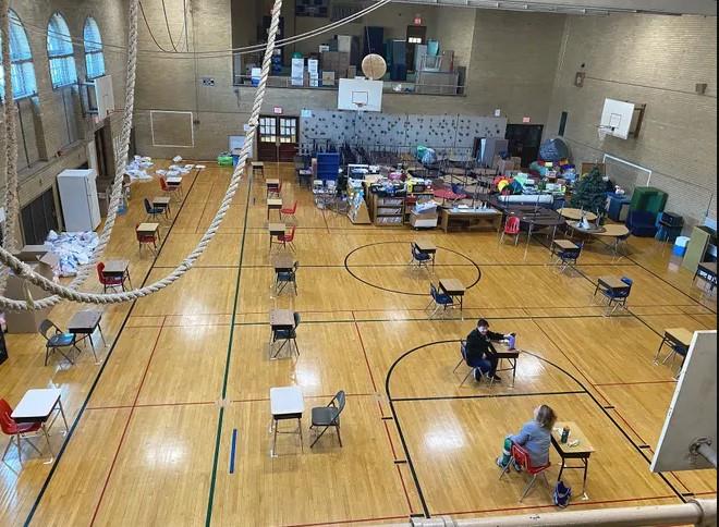 Today, the Elm Street School gymnasium has been transformed into a storage area amidst the COVID pandemic. It is the result of classrooms needing to socially distance to the new normal of 6 feet.